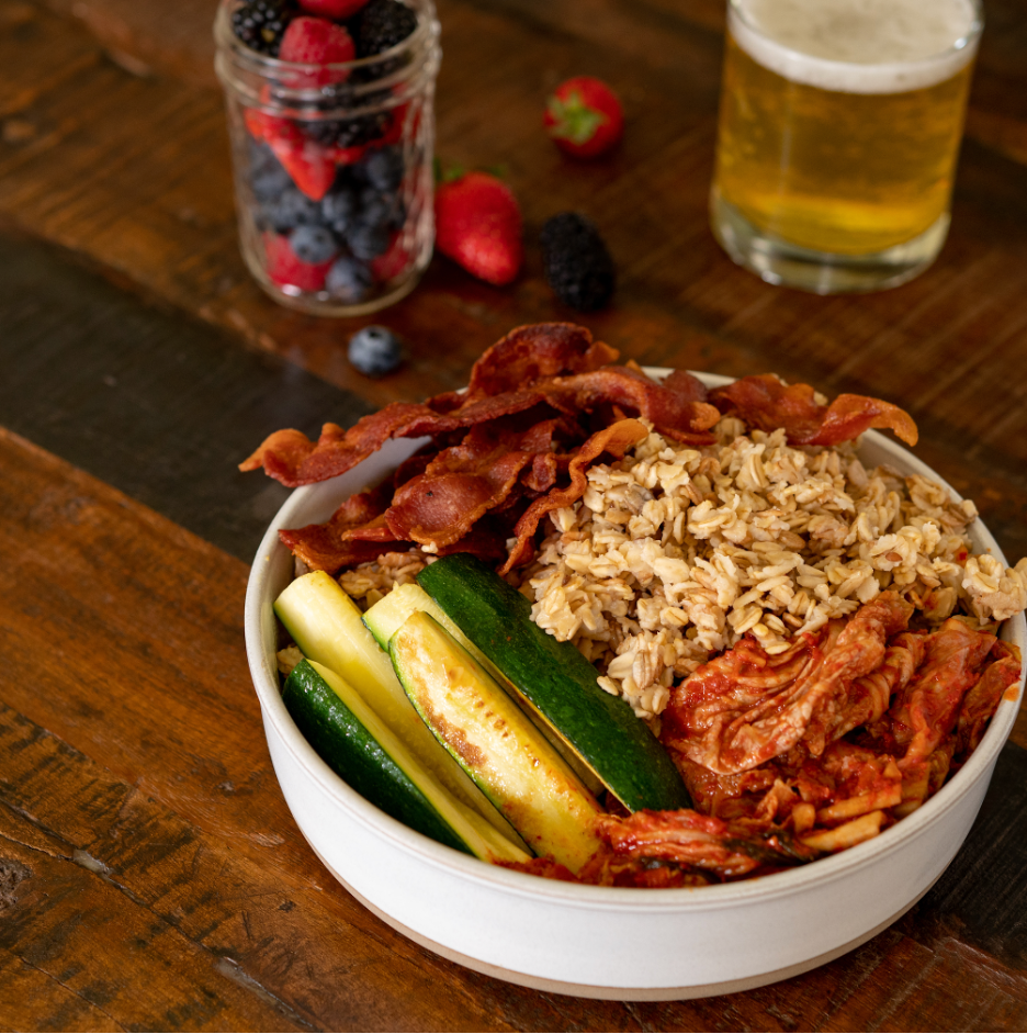 Organic Farmers doing breakfast at dinner. Kimchi Oatmeal + Fruit Bowl.